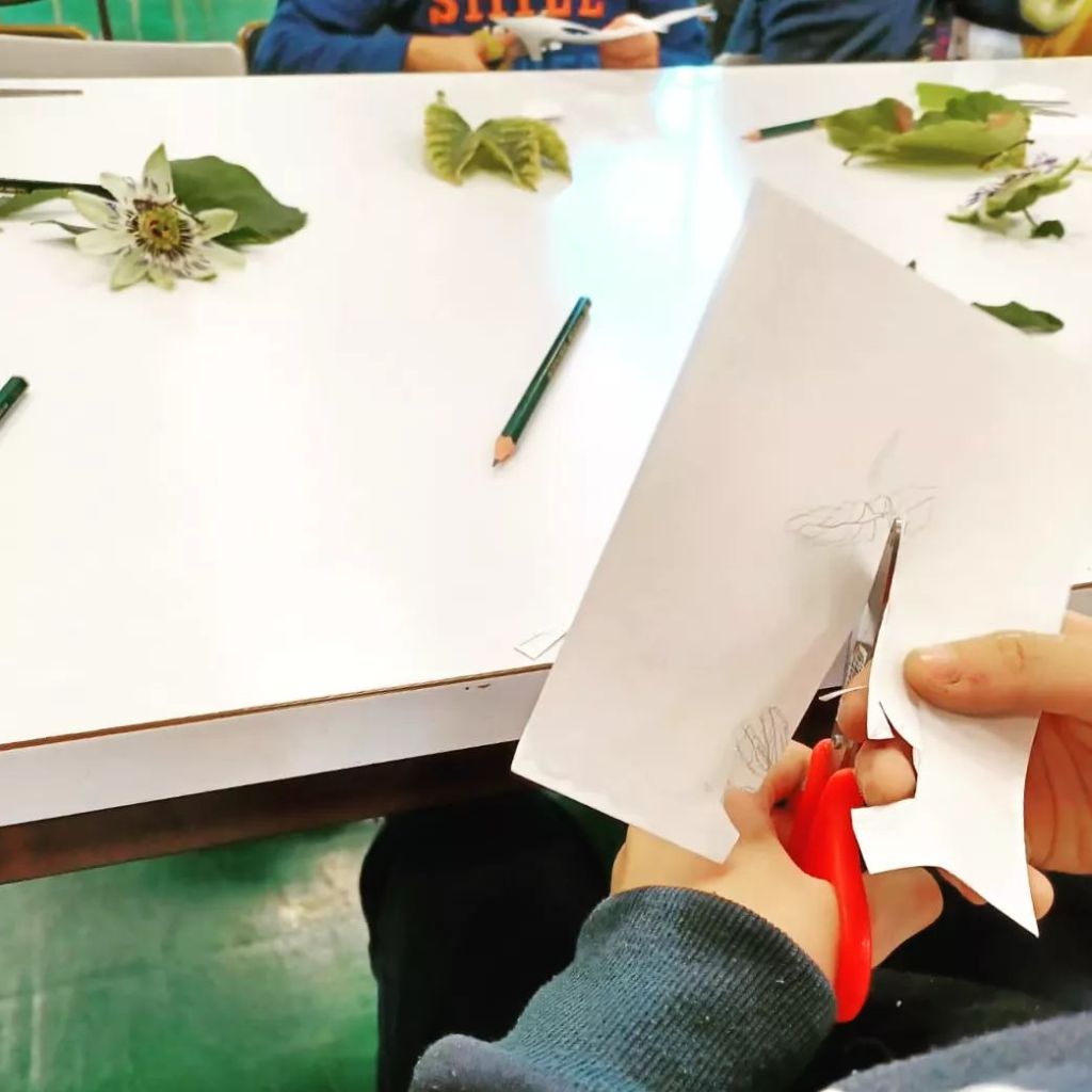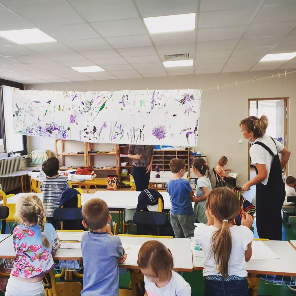 Les vendredis 23 et 30/09, ça a été à notre artiste résidente Hanni Angermann d’inaugurer ce projet. Cela fait partie de son travail de médiation d’intervenir auprès de l’école et elle l’a fait avec les élèves de CP qui ont pu découvrir les plantes et d’autres objets naturels du coin, les observer, les dessiner, les peindre jusqu’à créer d’autres plantes imaginaires.