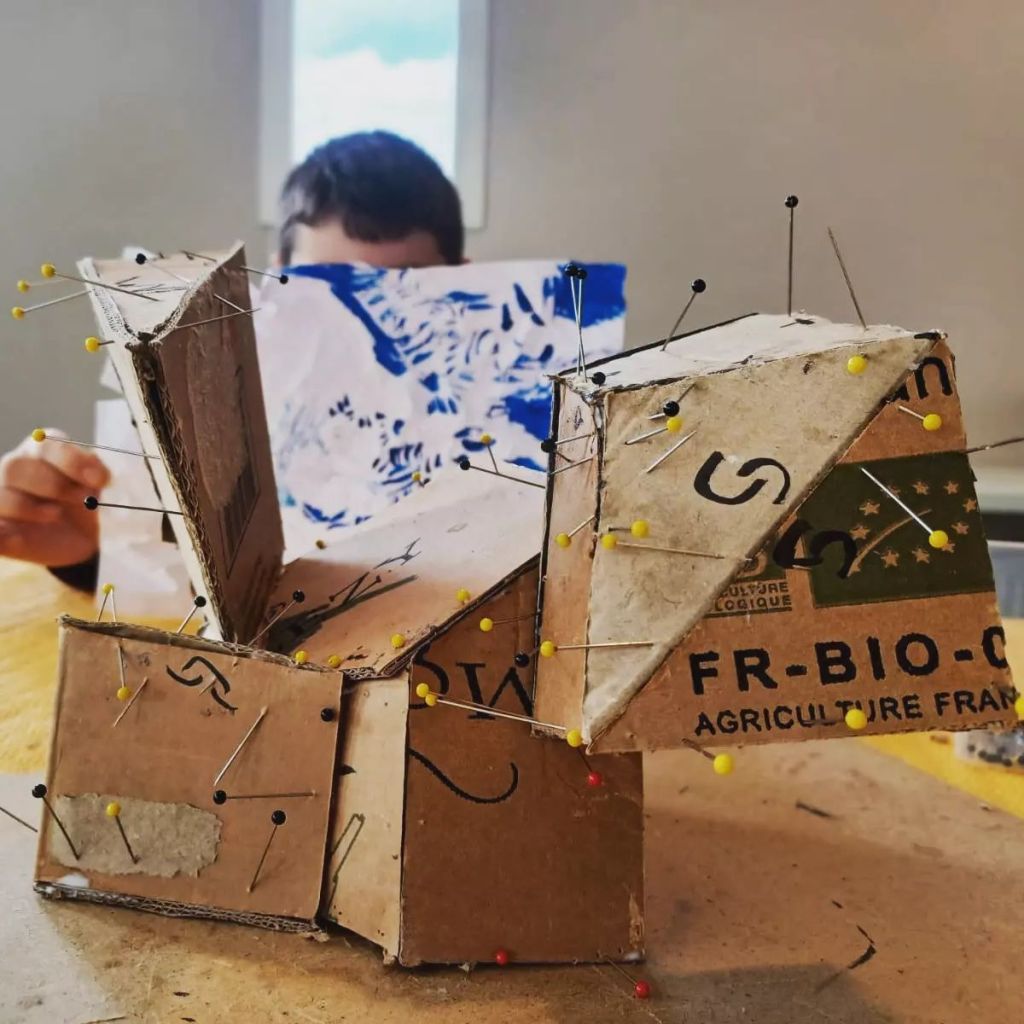 La pâte de carton constitue la matière de base de mes volumes, à laquelle seront ajoutées différentes terres locales qui en modifie la couleur et l’aspect, liant la pièce à son milieu. L’utilisation de matériaux de récupération et sans impact environnemental est primordiale dans ma démarche et est un sujet que j’aime aborder lors des différents échanges.