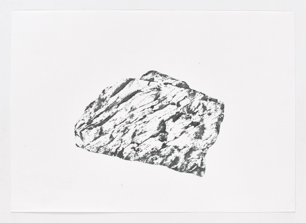 À Planèzes, j’ai pu faire le lien avec ma pratique et mes méthodes artistiques antérieures. D’une part, j’ai essayé de rendre visibles les mouvements du vent en prenant des séquences photographiques d’objets se déplaçant dans le vent et en les utilisant comme base pour des dessins. D’autre part, j’ai fait des impressions des pierres en latex et je les ai utilisées comme blocs d’impression.