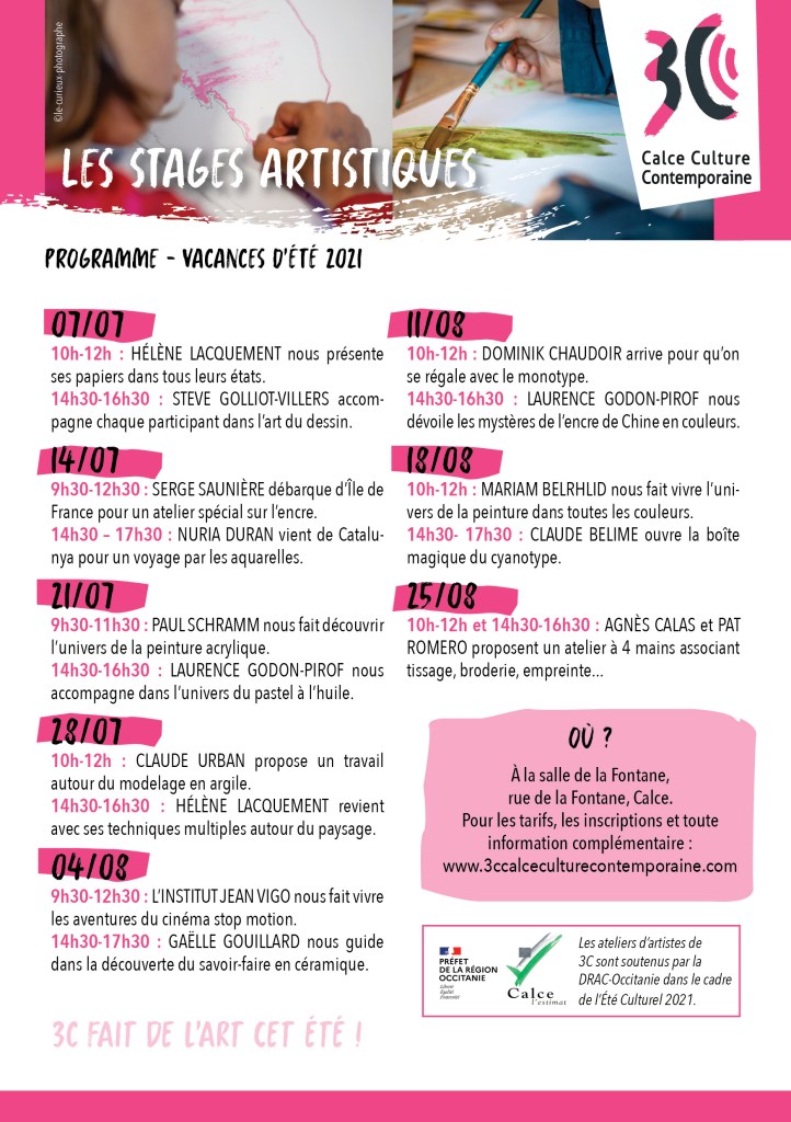 Les stages artistiques d’été de 3C sont soutenus par la DRAC-Occitanie dans le cadre du programme « Été culturel » et par la mairie de Calce.