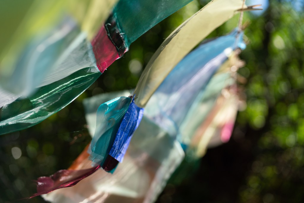 « L’essence des Phalènes de Muriel Valat-B est dans leur mouvement. Les phalènes sont des papillons de nuit qui témoignent d’une existence en perpétuelle transformation. Issues de la peinture devenue tissage et couture, celles de Valat-B se déplacent à la saveur du vent. La lumière les pénètre, elles changent leurs couleurs, formes et textures. C’est de cette façon que l’artiste approche au plus près cette impossibilité de figer la couleur et la lumière et qu’elle finit par inclure le mouvement dans ses œuvres d’une manière autre que pour ses gravures et pour ses dessins. Le papillon – l’imago par excellence – ne peut exister que sous un instant fugace, de passage. Le figer c’est lui donner la mort.