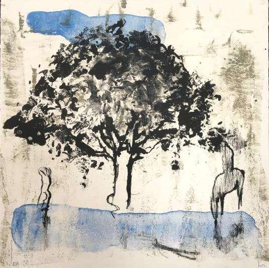 Happés par les lavis de l’artiste, nous pourrions observer Chiron, le centaure protecteur d’Artémis, sous un tilleul, faisant des confidences à Atalante, imaginons une scène en Arcadie. Les paysages de Patrick Loste confrontent une histoire passée à la fois commune et personnelle. » – HSV