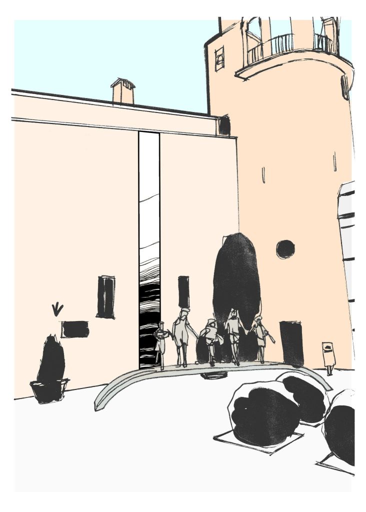 Les contrastes entre les couleurs pastel et les noirs profonds soulignent que des formes restent à innover. Si le trait de Steve Golliot-Villers reste pur, effilé, certain, pour les bâtiments, il est au contraire plus ramassé quand il s’agit de définir des aménagements d’ornementation. L’artiste dans la cité demeure un pilier de l’action collective, de la pensée dissidente et complémentaire, mais tout ne peut lui incomber ; aux citoyens également de modeler le noir comme une matière dont on pourrait extraire un futur embelli, commun et ouvert. » – HSV
